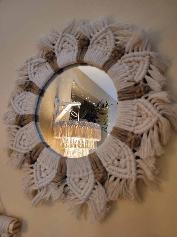 Espejo tejido en macramé con hilo rústico de algodón color natural, yute o combinado.