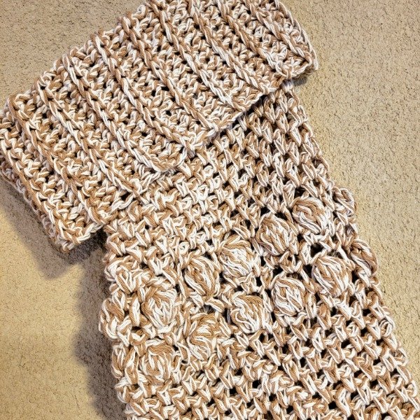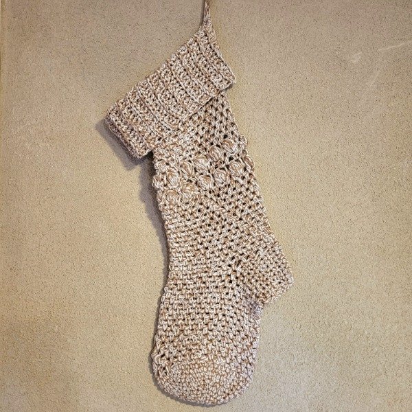 Bota navideña tejida a crochet con hilo de algodón, combinada en camel y blanco.