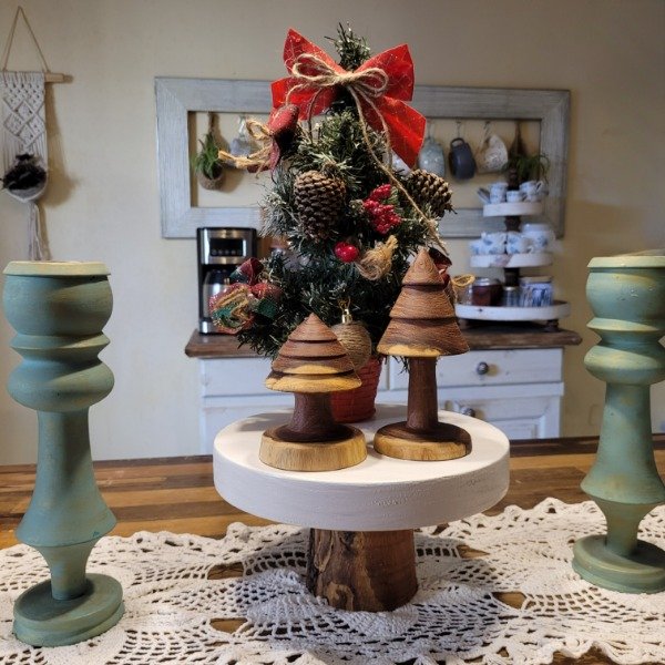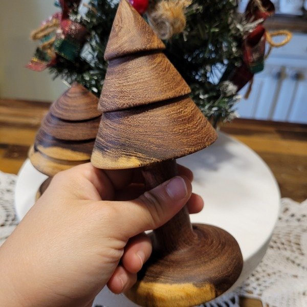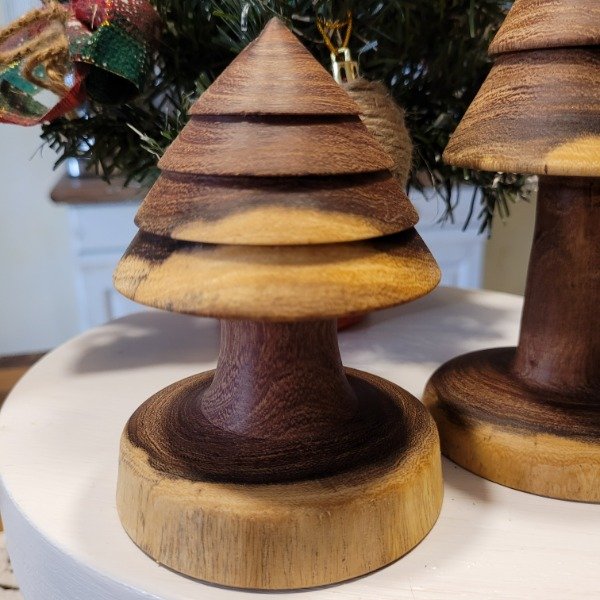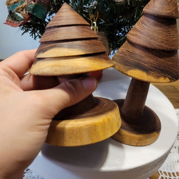 Set de dos unidades de pinos navideños torneado artesanalmente en madera de algarrobo, y protegidos con aceite de lino.