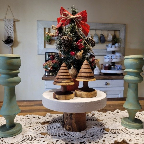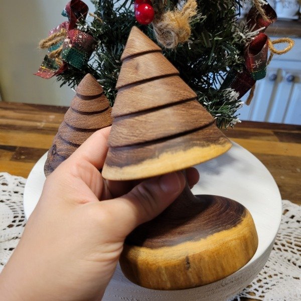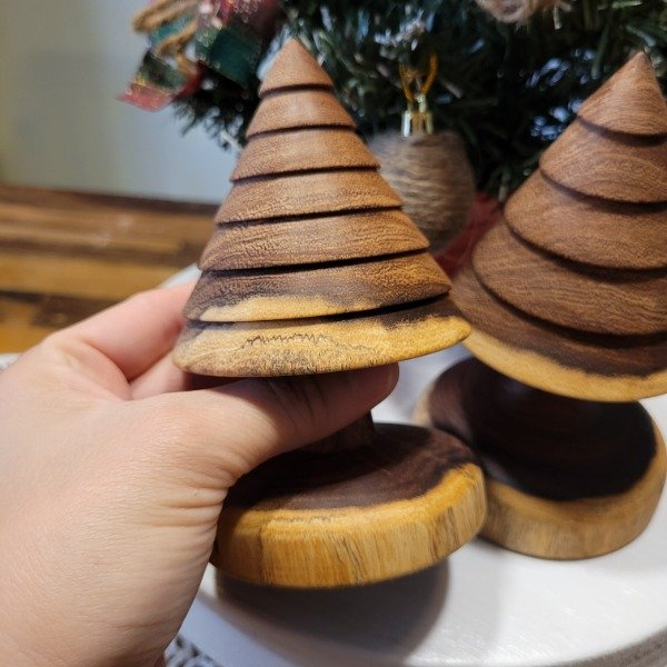 Set de dos unidades de pinos navideños torneado artesanalmente en madera de algarrobo, y protegidos con aceite de lino.
